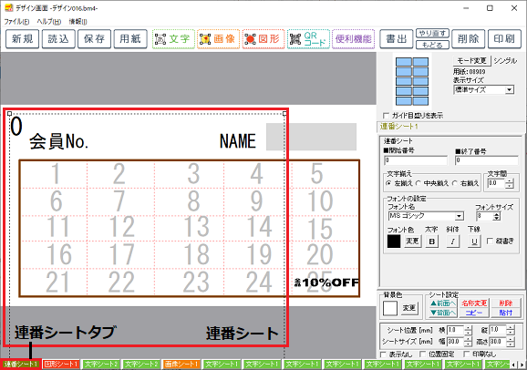 画面右側のシート編集エリアで連番の設定をします。
