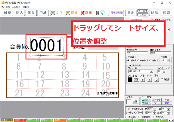 連番を設定しましたら、マウスの操作でドラッグしてシートサイズ、位置を調整します。