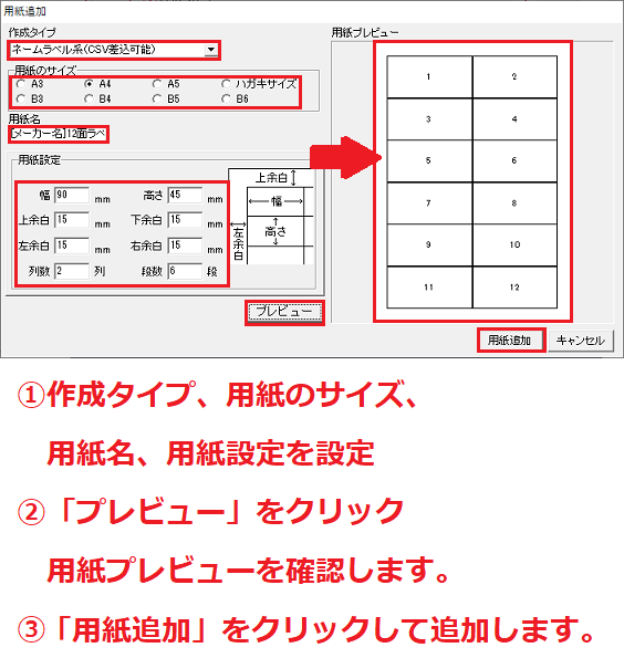 用紙追加画面が表示されますので [作成タイプ] [用紙のサイズ] [用紙名] [用紙設定]を
