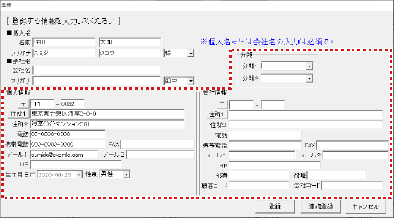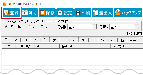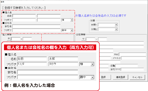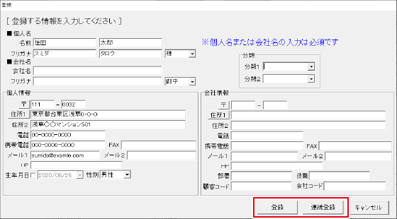 続けて住所録データを登録する場合は、「連続登録」ボタンをクリックすると、
