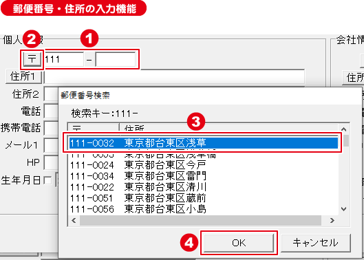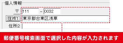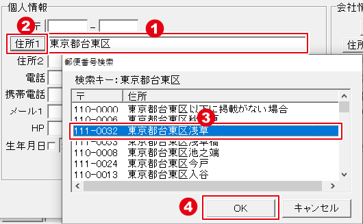 該当する住所を選択し、 「OK」ボタンをクリックしますと、[住所1]の欄に住所が自動入力されます。