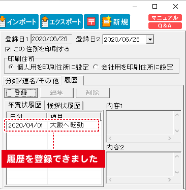 右側には、まだ未設定の設定項目が表示されます。印刷住所の選択、分類、連名、その他、備考)、履歴の登録を行う欄が表示されます。
