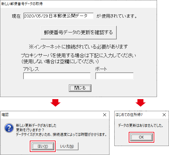 新しい郵便番号のデータがある場合、更新の有無を確認する画面が表示されます。
