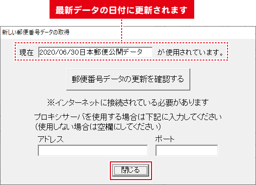 本ソフトの「郵便番号更新」機能は、市町村の合併などで郵便番号の更新があった場合など、新しい郵便番号のデータをサーバーより取得して、本ソフトのデータを最新の状態に保ちます。