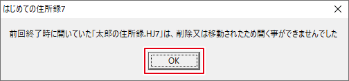 前回開いたファイルの保存場所を変更した場合は、以下のメッセージが表示されます。