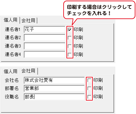 連名を差出人印刷する場合は、入力欄の右隣にある印刷チェックボックスをクリックしてチェックを入れてください。