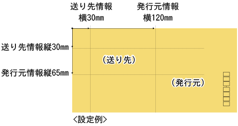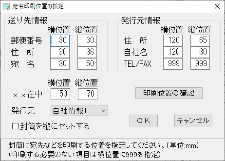 送り先情報、発行元情報、xx在中の印刷位置を数値を入力して、設定します。