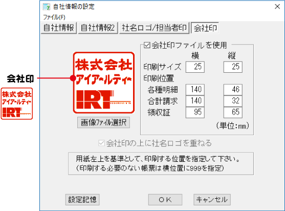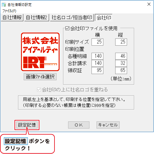 すべて入力し終わりましたら、設定記憶ボタンをクリックして、会社印を保存します。