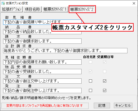 帳票カスタマイズ2の設定を保存し、本ソフトを再起動します。