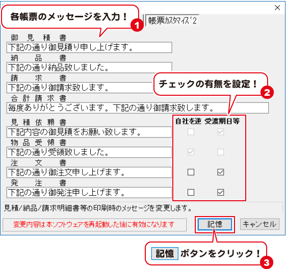 各帳票毎の入力欄に、メッセージを直接入力してください。