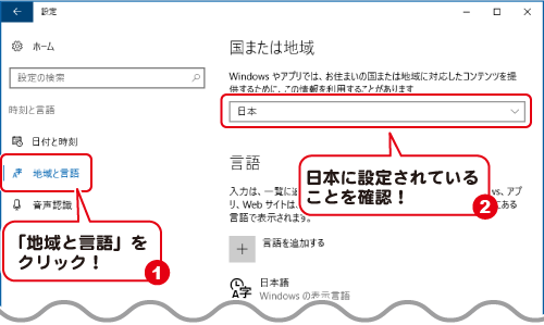 4.「時刻と言語」画面が表示されましたら、左側のメニューにある「地域と言語」をクリックし、国または地域が「日本」に設定されていることを確認します。