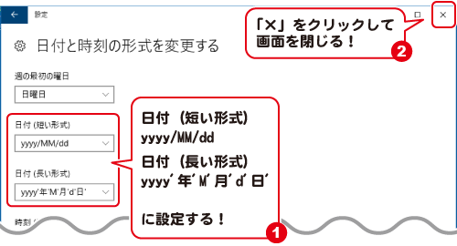- A : Windowsの日付形式の設定が標準のもの以外になっているとアプリケーションソフトが正常に動作(表示等)がされない場合があります。以下の手順で設定をご確認の上、標準の設定にて本ソフトをご使用ください。
