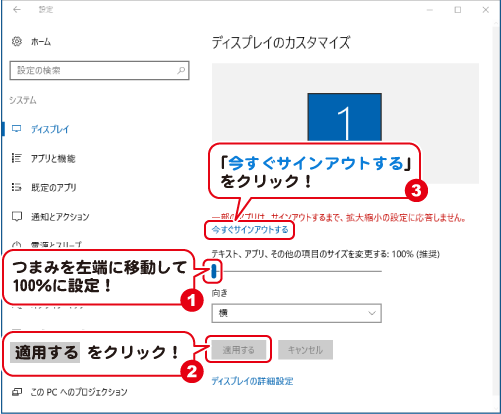 - 「ディスプレイのカスタマイズ」が表示されましたら、青色のつまみを左端に移動して100%に設定し、「適用する」ボタンをクリックします。