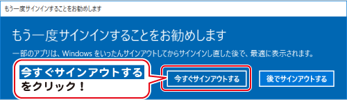 - 「一部のアプリは、Windowsをいったんサインアウトしてからサインインし直した後で、最適に表示されます」と表示されますので、「今すぐサインアウトする」をクリックします。