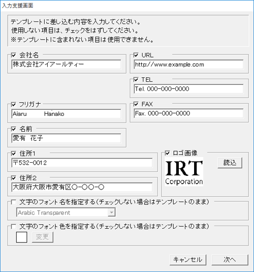 | 文字のフォントを変更したい場合は、チェックボックスに チェックを入れます。▼をクリックして、使用するフォントを選択します。チェックしない場合は、テンプレートのままです。 |