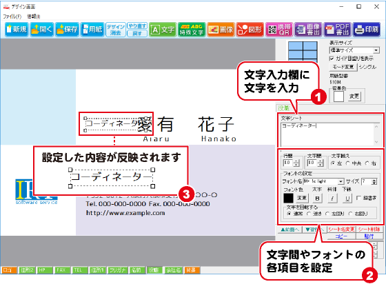 行間、文字間、文字揃え、縦書き/横書き、 フォント(フォントの種類・サイズ・色等) の設定をします。