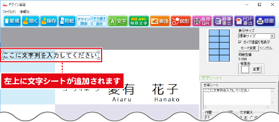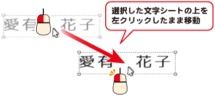 文字シートの枠内を左クリックしたまま、マウスを移動すると文字を移動できます。