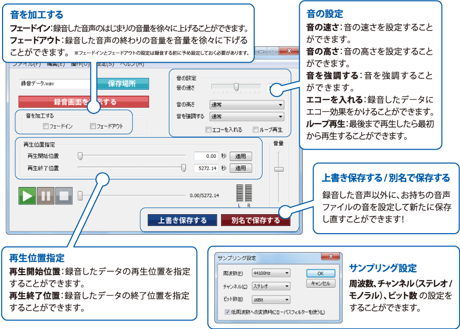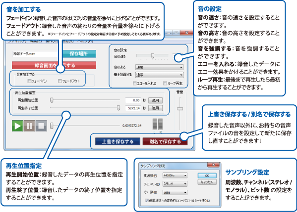 ※再生しながら調節できるのは、音の高さ、音の速さ、音の強調、エコーのみです。