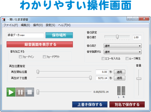 『聞いたまま録音』は、誰でもかんたんにパソコン上の音を録音してパソコンに保存できるソフトです。