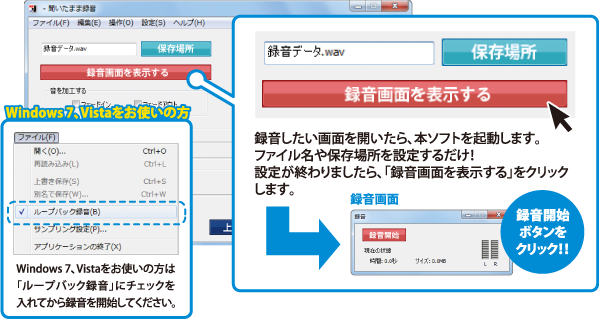 保存内容を設定し、録音画面を表示、あとは録音開始ボタンをクリックするだけのかんたん操作です!