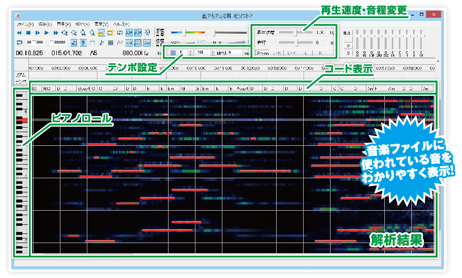 『誰でもできる耳コピソフト2』は音源を解析して、 かんたんに採譜できるソフトです。
