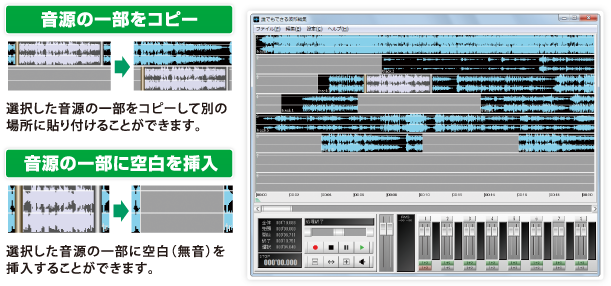 音楽ファイルの「録音」「再生」「編集」、音楽の「切り取り」「コピー」「貼り付け」の他