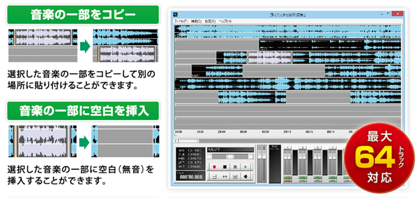 音楽ファイルの「録音」「再生」「編集」、音楽の「切り取り」「コピー」「貼り付け」の他
