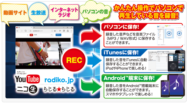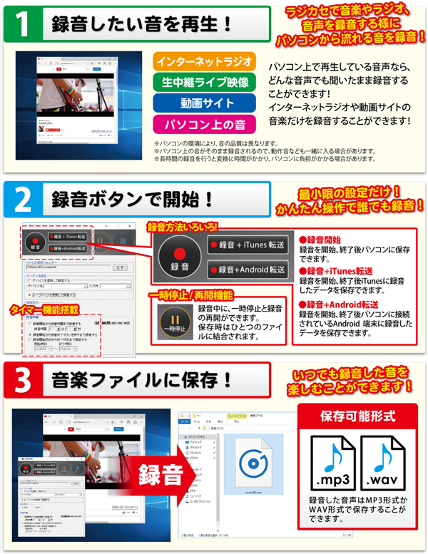 かんたんな操作でパソコン上の音を録音することができ、