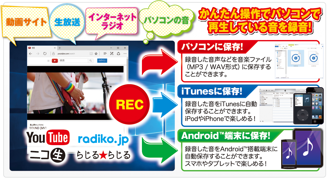 パソコンから流れている音を録音して音声ファイル(MP3 / WAV)形式で保存することができます!