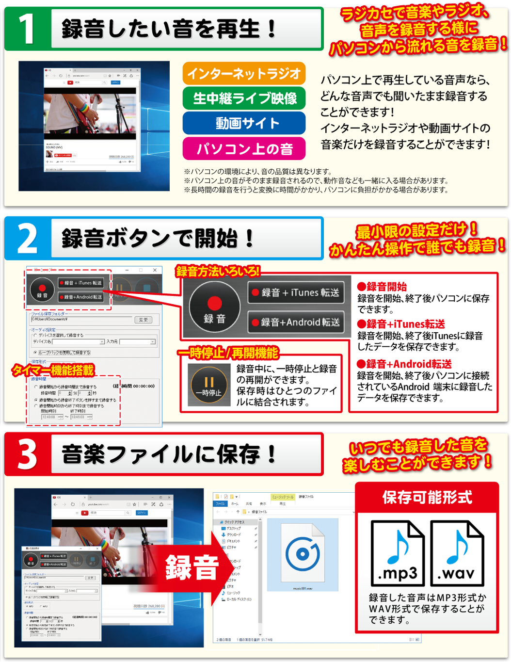 保存内容を設定し、録音したい音声や音楽を準備、あとは録音ボタンをクリックするだけの