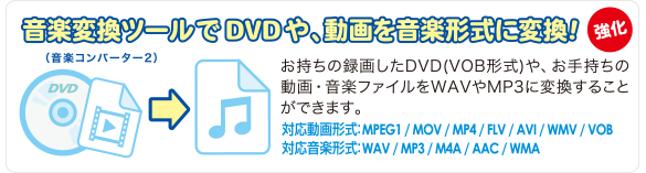 ※音楽変換ツールはDVDの動画のチャプターや動画・音楽ファイルをWAV/MP3形式に変換する