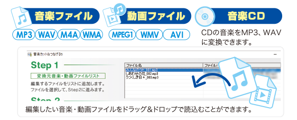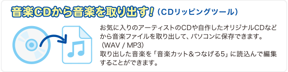 | 対応ファイル形式 | <音楽カット&つなげる5> <音楽コンバーター2> <CDリッピングツール> |
