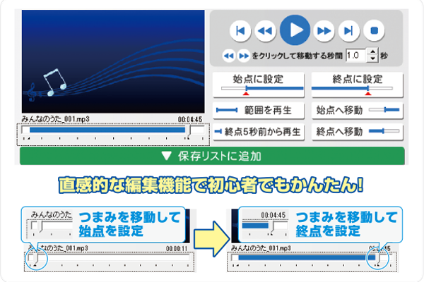 ※WAV / MP3に変換できるので、iPod・Android搭載スマートフォンなどの機器に入れて再生することもでき、DVD / CDの音楽を持ち歩くことができます。保存した音楽ファイルは、「音楽カット&つなげる5」で編集できます。
