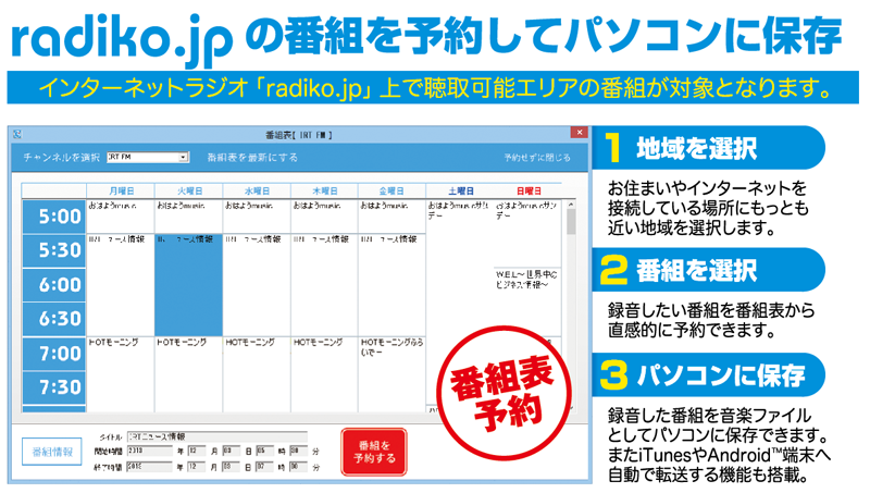 『ネットラジオ予約録音』は、人気のインターネットラジオ「radiko.jp」の番組を