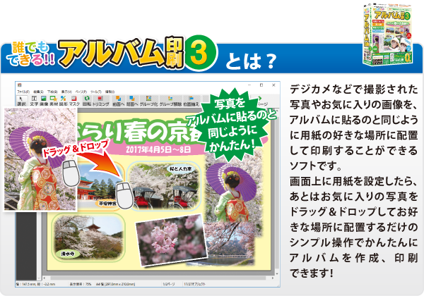 用紙に写真を配置する感覚でアルバムを作成・印刷できるソフトです。