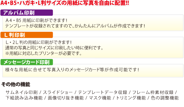 | プリンター | 対応OS上で正常動作するA4 / B5 / 2L判 / L判 / ハガキサイズに 印刷可能なレーザープリンターもしくはインクジェットプリンター |
