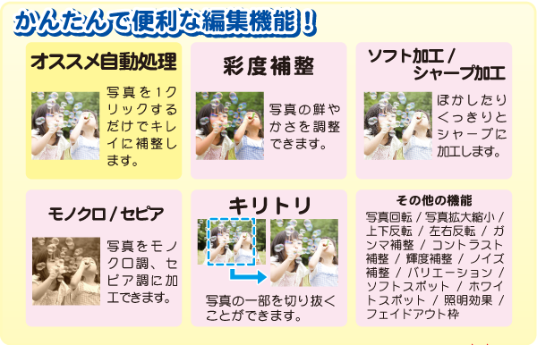 また、写真編集が苦手な方でも安心な「自動補正」機能を搭載。