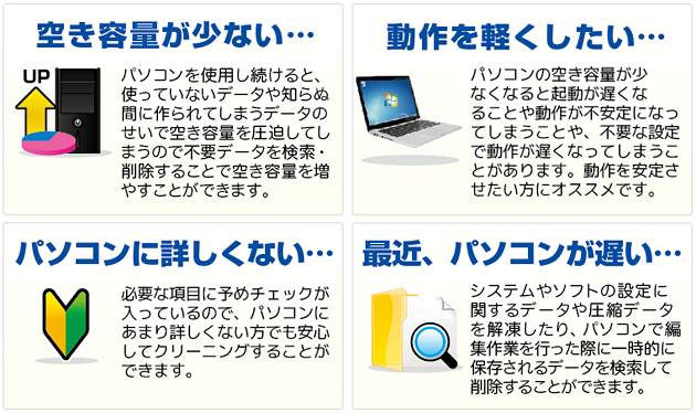 パソコン上の不要なファイル、レジストリを削除して、パソコンを軽量化したり、