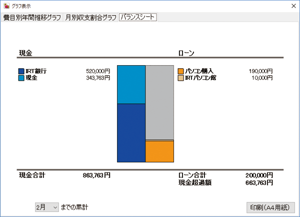 現金や預金とローンのバランスを確認することができ、それぞれA4用紙への印刷にも対応。