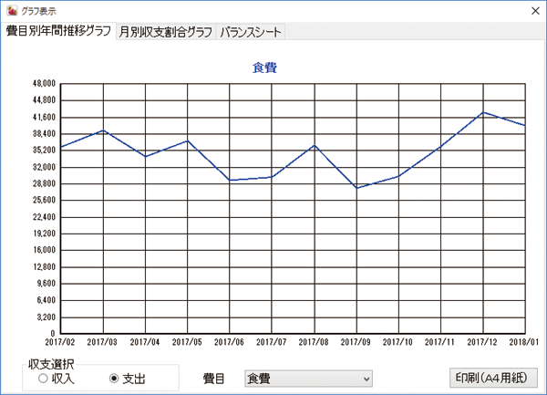 目的に応じて家計簿データの絞込み集計ができ、印刷も可能です。
