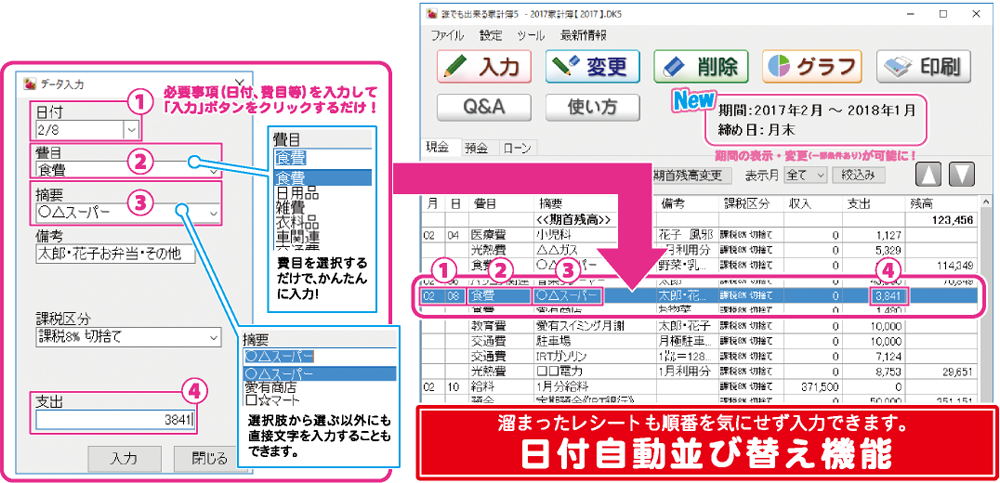 レシート等の日付順番を気にせずにデータ入力ができます。
