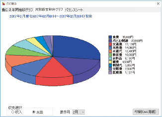 費目別や収支割合をひと目で把握できるグラフ表示の他、