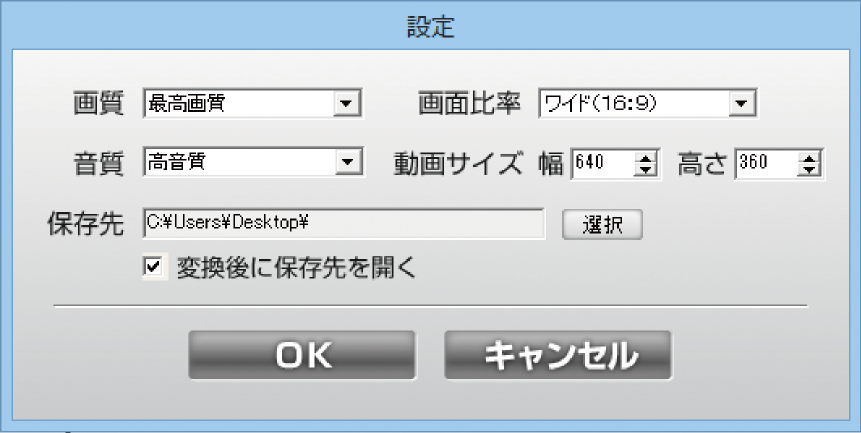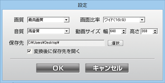 動画のサイズ・音質・画質を変換する設定をします。