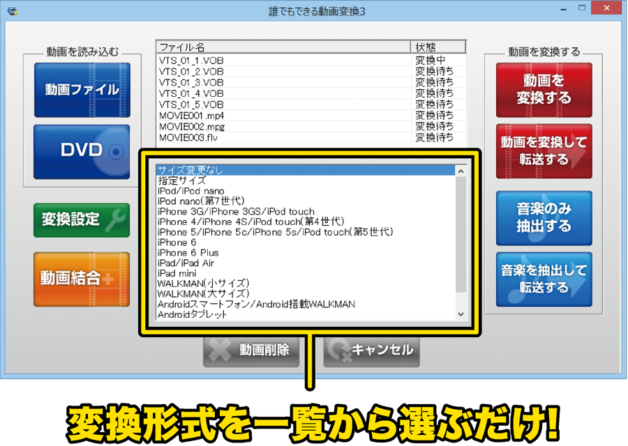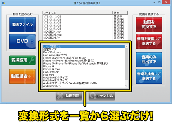 「誰でもできる動画変換3」は、パソコン上の動画ファイルやお手持ちのDVDを変換して