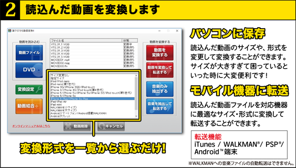 「誰でもできる動画変換4」は、お手持ちのDVDやパソコン上の動画ファイルを変換して
