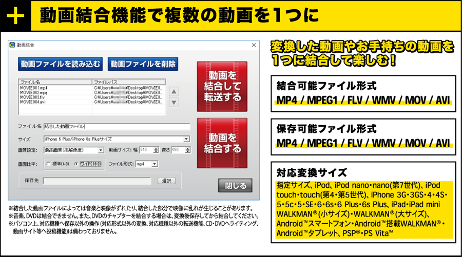 | 対応動画形式 | 動画変換機能 動画結合機能 ※品質は元の動画状態に依存します。 |