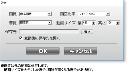 変換したい動画を読み込み、サイズ、画質、画面比率、音質を設定するだけで、