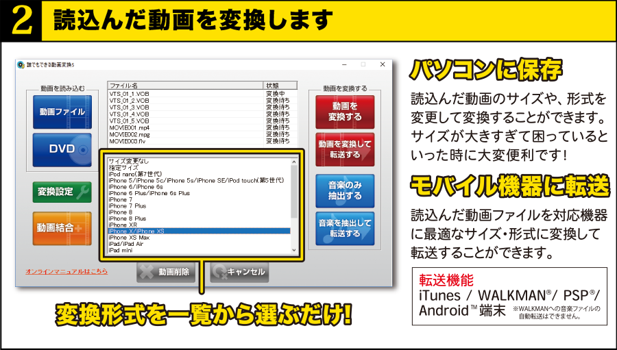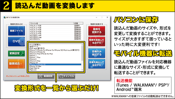 変換してパソコンで楽しむことや各種iPod、iPhone、iPad、WALKMAN、PSP、PS Vita、