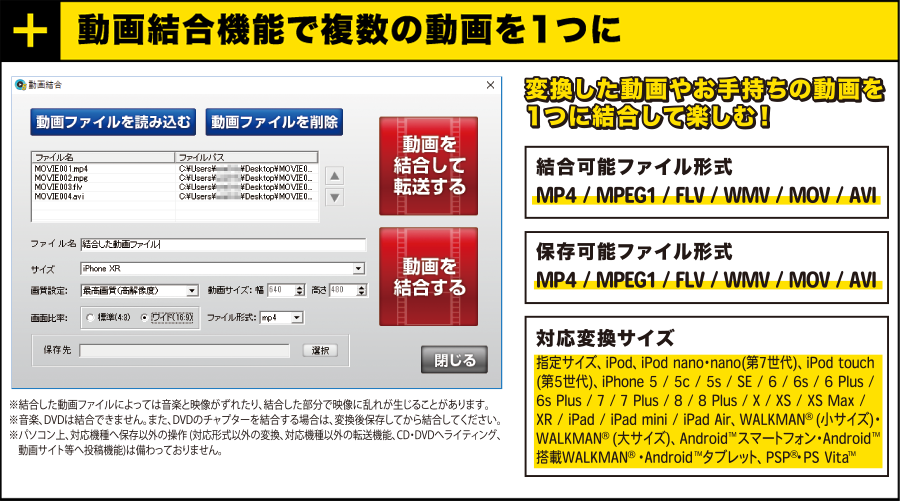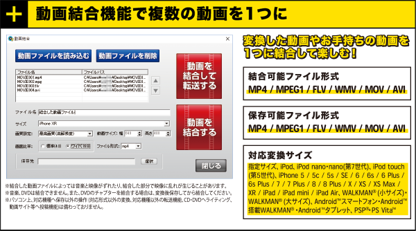 | 対応動画形式 | 動画変換機能 動画結合機能 ※品質は元の動画状態に依存します。 |