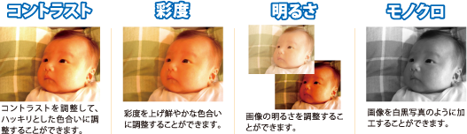 (コントラスト / 彩度をあげる / 明るさ調整 / モノクロ)がありますので